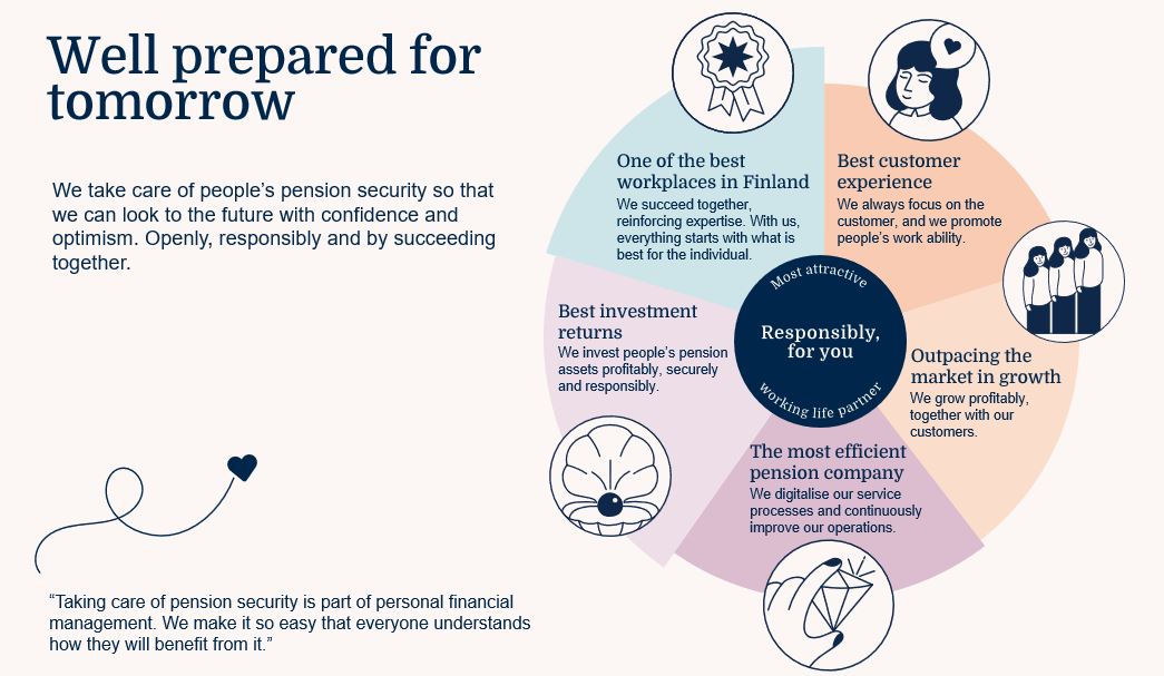 Our long-term goal is to be one of Finland’s best places to work, offer the best customer experience and the best solutions in the sector, and grow profitably and faster than the market. Our goal is to be the most efficient earnings-related pension insurance company, with the sector’s best returns on investment.