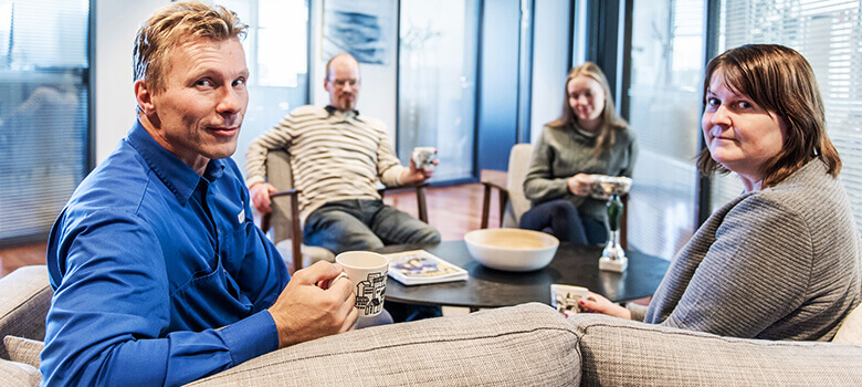 Keskustelua käydään yrityksen sisälläkin paljon. Kumpulainen uskoo, että kehityskeskustelun lisäksi tarvitaan silloin tällöin käytäviä puheeksiottokeskusteluja, joissa voidaan hyvinkin epämuodollisesti vaihdella kuulumisia. Näissä tärkeää on luottamus – Kattotutkan toinen arvo.