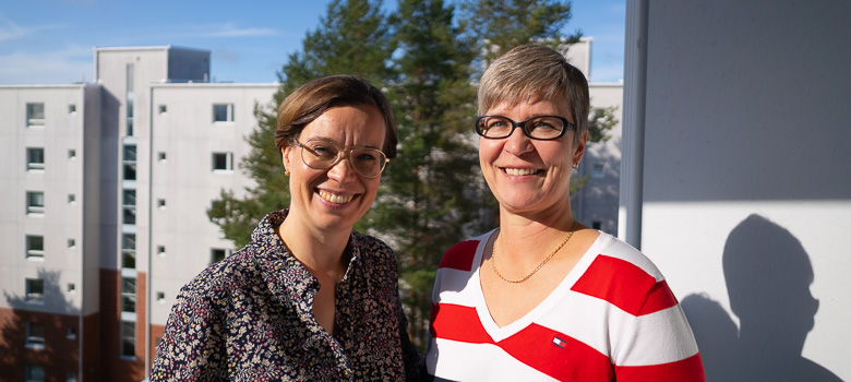 Leena Lehtonen ja Sanna Miettinen Opiskelijahelpparin pop up - asunnon terassilla Hervannassa.