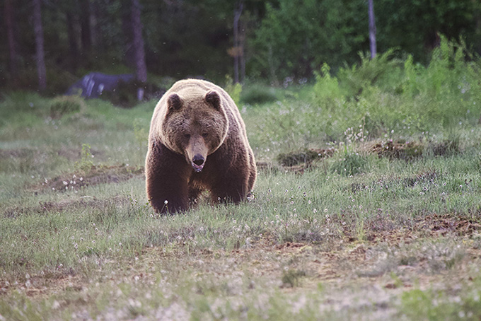 – Vietimme kesäkuun alussa yön piilokojussa keskellä Kuhmon metsiä, noin kilometrin päässä itärajasta. Tavoitteemme oli nauttia yöttömän yön tunnelmasta ja mahdollisesti nähdä suomalaista eläimistöä linnuista nisäkkäisiin, mutta hellesään myötä oletimme eläinten viihtyvän mieluummin viileissä koloissaan ja pesissään. Yhden aikaan yöllä edessämme olevalle aukealle kuitenkin käveli sellainen ilmestys, että unohdin joksikin aikaa käsissäni olevan kameran ja pystyin vain tuijottamaan valtavaa uroskarhua silmiä räpäyttämättä, sanoo Lassi Antila.