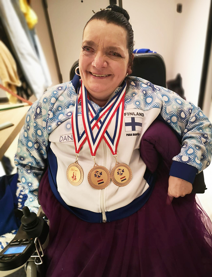 Olen Pirjo Pappila, 55, ja olen kilpaillut paratanssijana yli 7,5 vuotta. Kuulun Suomen paratanssin maajoukkueeseen, jossa tanssin singlenä eli yksin ilman paria kotimaisissa ja ulkomaisissa kisoissa.