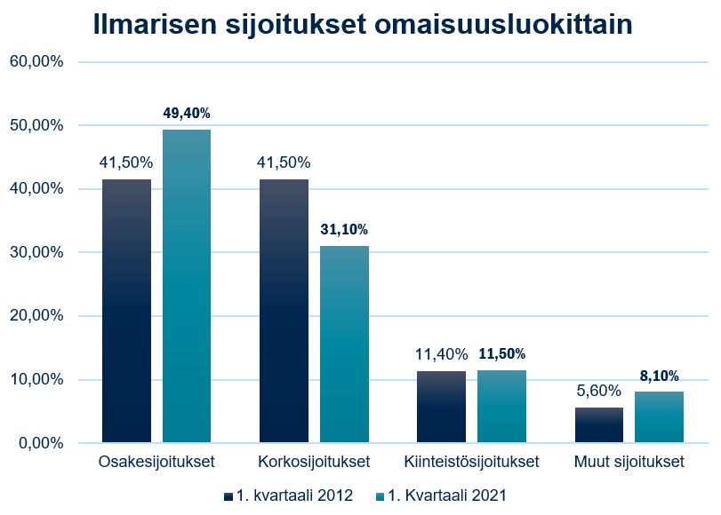 Ilmarisenkin sijoitusten jakauma on muuttunut huomattavasti yhdeksässä vuodessa: osakkeiden osuus on lisääntynyt korkosijoitusten kustannuksella.***