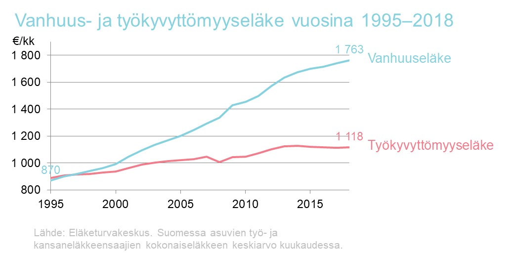 Myös keskimääräisen vanhuus- ja työkyvyttömyyseläkkeen välinen ero on kasvanut. Vanhuus- ja työkyvyttömyyseläke olivat vielä vuonna 1995 lähes samansuuruiset, mutta 2000-luvulla ero on kasvanut vuosi vuodelta. Vuonna 2018 vanhuuseläkeläisten kokonaiseläke oli lähes 1 800 euroa, kun työkyvyttömyyseläke oli alle 1 200 euroa.
