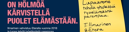 Ilmarinen ja Etera yhdistyvät 1.1.2018 alkaen muodostaen kustannustehokkaan ja vakavaraisen työeläkeyhtiön. Suomen suurin yksityisten alojen työeläkevakuuttaja haluaa myös ottaa entistä vahvemman roolin paremman työelämän rakentamisessa.