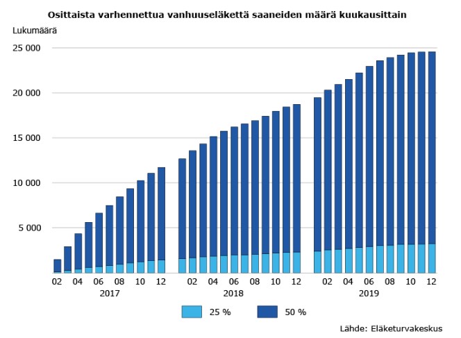 Vuoden 2019 lopussa ETK:n tilaston mukaan oli voimassa 24 600 osittaista vanhuuseläkettä. Lähes 90 prosenttia oli valinnut eläkkeen 50 prosentin suuruisena. Viime vuoden lopussa 25 prosentin tasoisena eläkettä maksettiin 3 200 henkilölle.