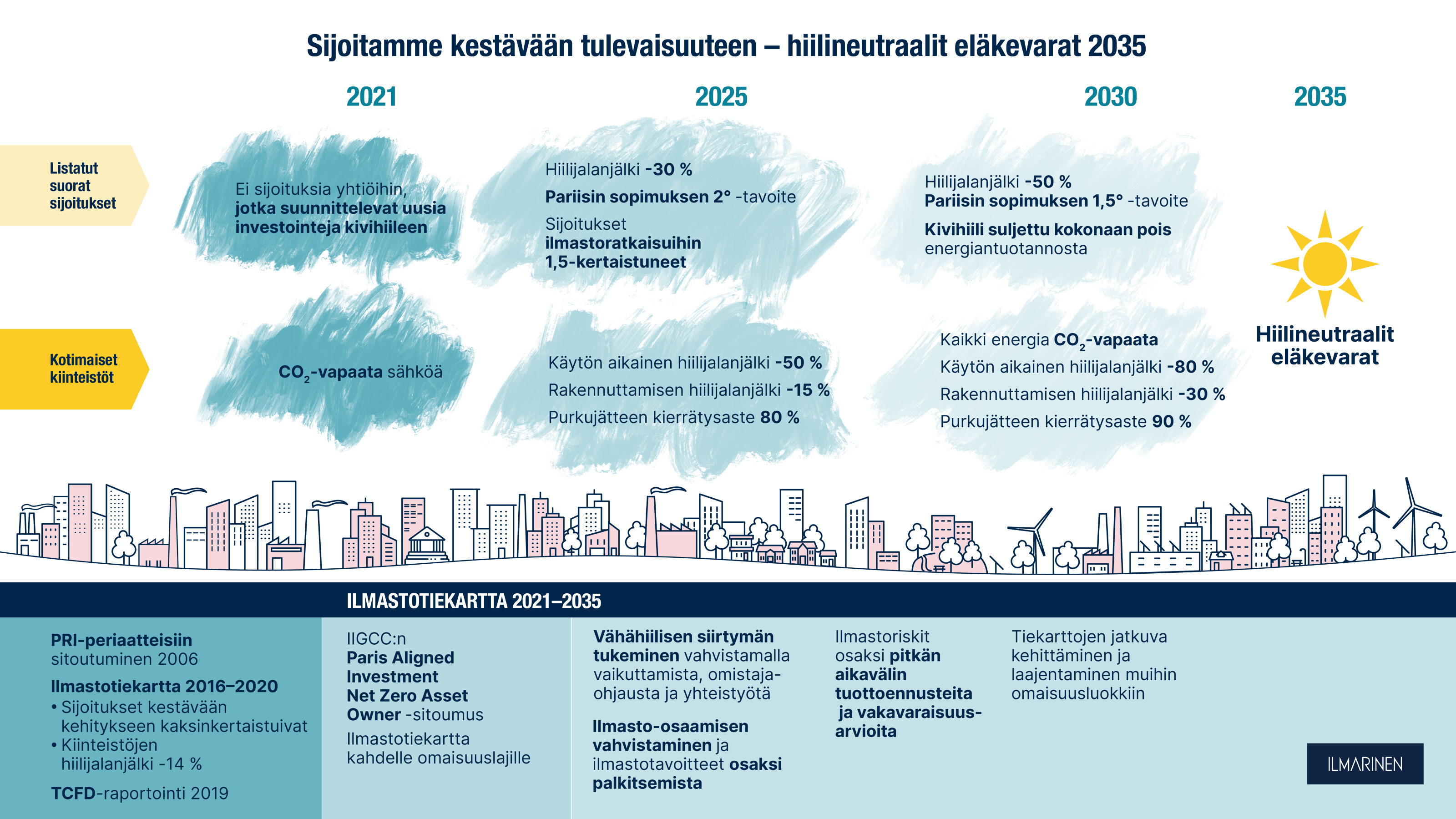 Ilmarisen ilmastotiekartta kuvaa sitä, miten Ilmarinen pyrkii kohti hiilineutraalia eläkevarojen sijoittamista vuonna 2035. Tavoite on osa sijoitusten vastuullisuus- eli ESG-riskien ja vaikuttavuuden huomioimista. Huomioimalla vastuullisuusriskit Ilmarinen edistää eläkevarojen sijoittamista tuottavasti ja turvaavasti.