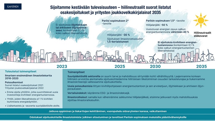 Uudessa ilmastotiekartassa kerrotaan välitavoitteista, tärkeimmistä toimenpiteistä ja keinoista seurata edistymistä. Näiden avulla Ilmarinen pyrkii kohti tavoitetta hiilineutraalista eläkevarojen sijoittamisesta vuoden 2035 loppuun mennessä.