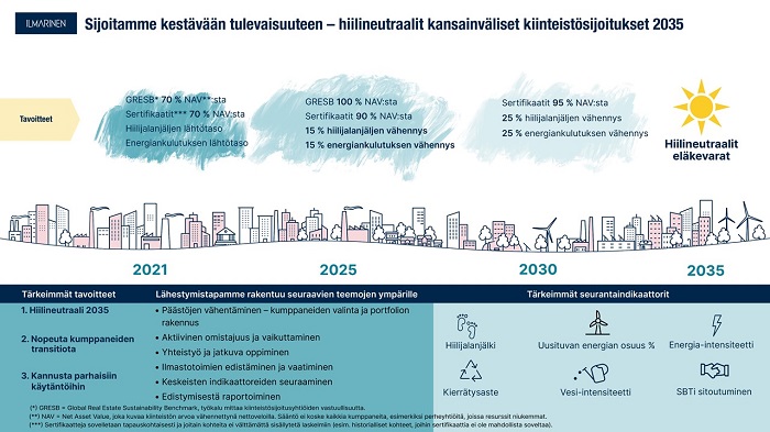 Ilmarinen asettaa ilmastotavoitteet kahdelle uudelle omaisuuslajille: yritysten joukkovelkakirjalainoille ja ulkomaisille kiinteistöille. Jo aiemmin laadittiin suunnitelmat suorille listatuille osakesijoituksille ja kotimaisille kiinteistöille.
