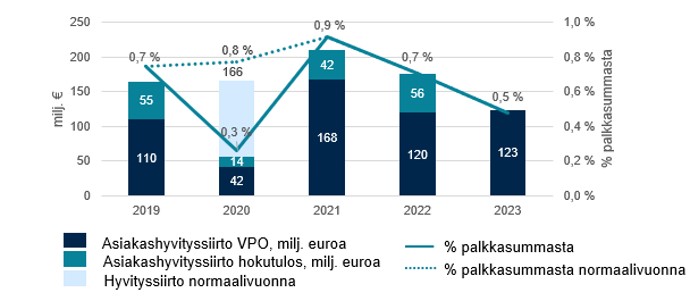Asiakashyvitykset milj. euroa ja suhteessa palkkasummaan