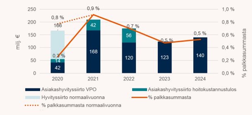 Asiakashyvitykset milj. euroa ja suhteessa palkkasummaan