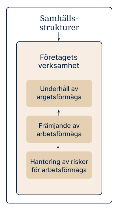 Strukturerna i det finska samhället bestämmer hur företagets verksamhetsmiljö och handlingsmöjligheter ser ut. Företagets praxis bestämmer hur ni kontrollerar riskerna för arbetsoförmåga, främjar arbetsförmågan och värnar om arbetstagarnas välbefinnande.