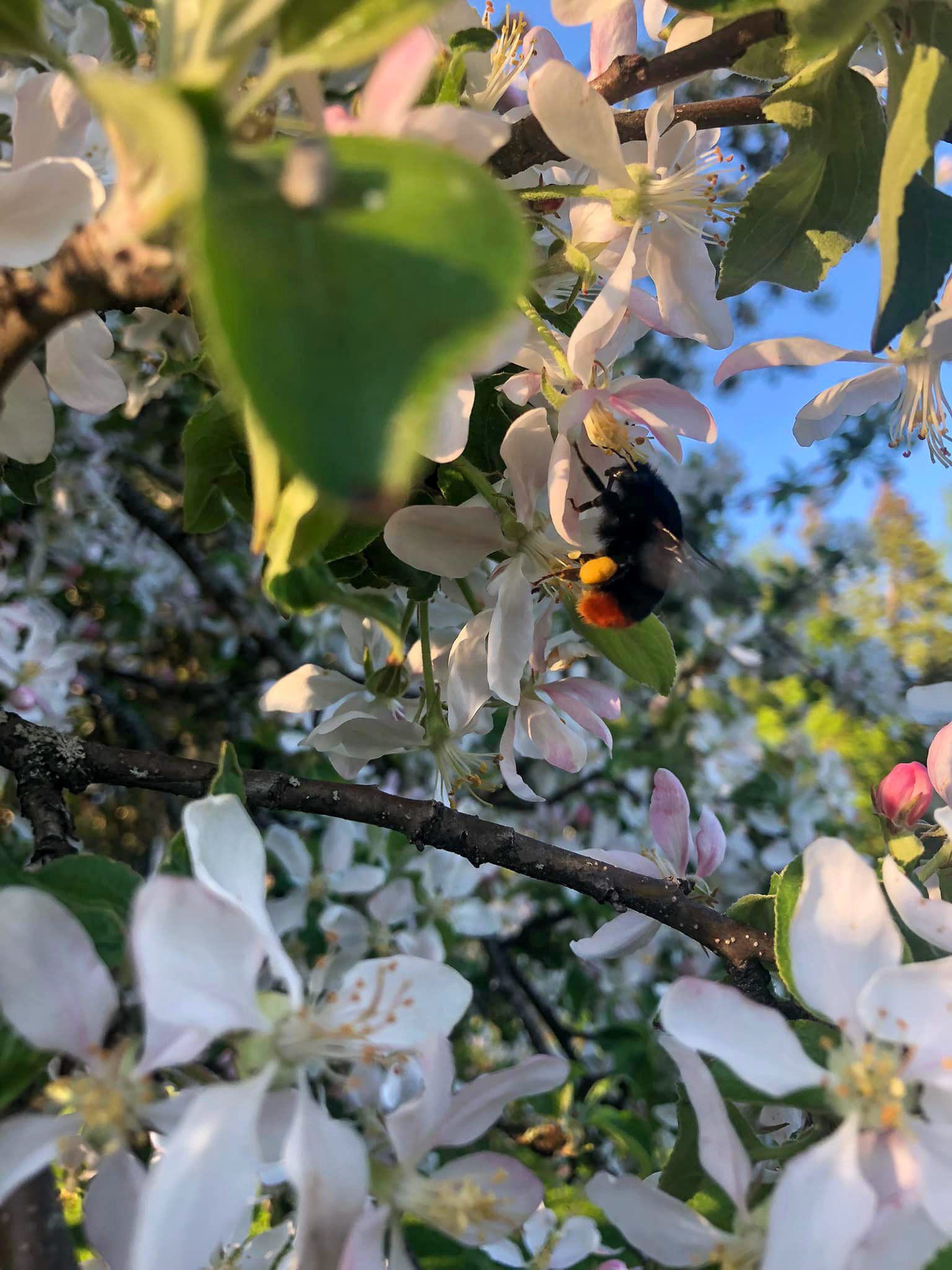 – Omppupuut kukkivat ja pörriäiset tekevät hommia niin, että jalat ovat täynnä siitepölyä, Ojala kertoo kuvastaan.