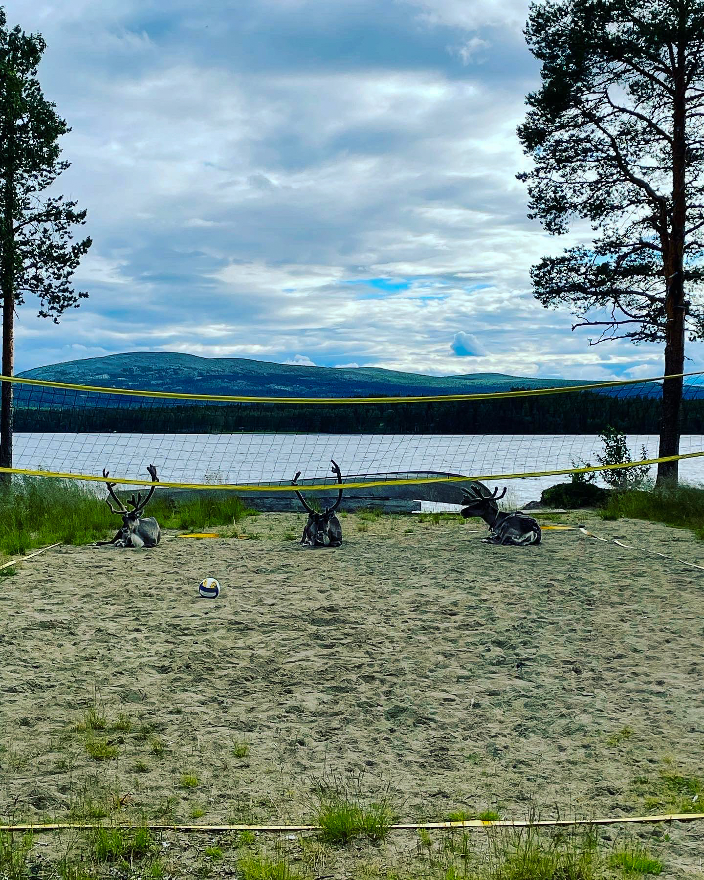 Hannu Mykkälän kuvassa porot odottavat peliseuraa rantalentopallokentällä. Kuva on otettu Pyhätunturilla Pelkosenniemellä.