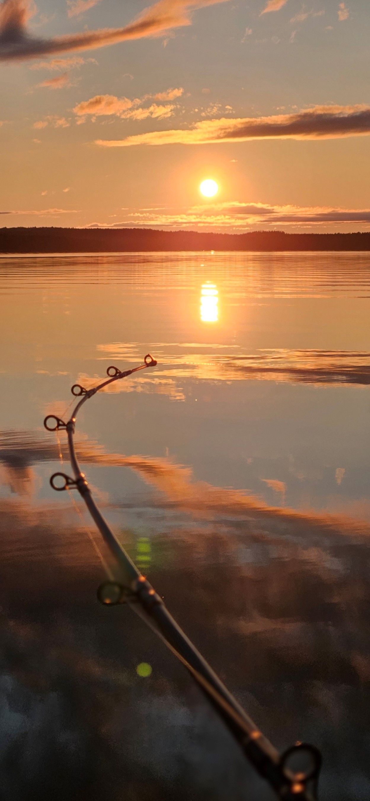 ”Kalassa” on Heidi Suomelan ottama valokuva, jossa kesäillan viimeiset auringonsäteet heijastuvat peilityyneen vedenpintaan. Onkivapa luo kuvan etualalle kiinnostavan perspektiivin.