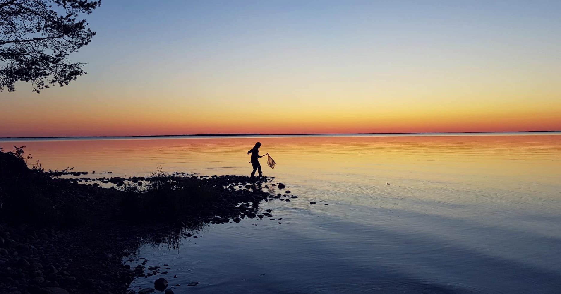 – Olimme poikani kanssa kalassa Kainuun merellä Manamansalossa Oulunjärven rannalla mökkireissulla, josta kuva on otettu auringon laskiessa taivaanrantaan. Kalaa ei tullut, mutta tunnelma oli käsin kosketeltava, hän kertoo.