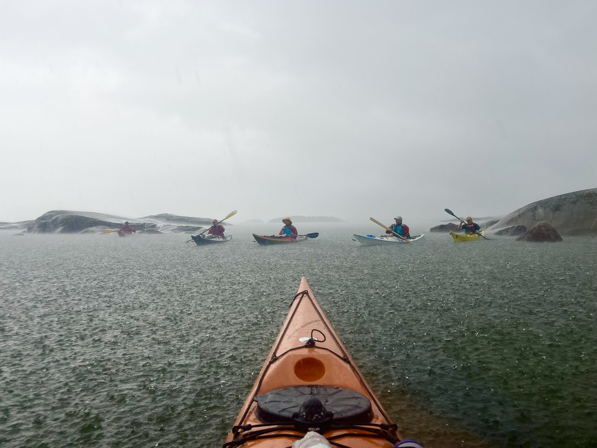 Inka Suhonen ikuisti ryhmän melojia kesäsateessa kuvaan ”Sataa, sataa, ropisee”.
