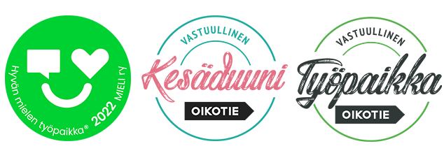 Olemme saaneet jo kolmatta kertaa peräkkäin MIELI ry:n Hyvän mielen työpaikka -merkin. Tunnustus kertoo, että meillä on hyvä olla ja työskennellä, ja panostamme vahvasti työkykyyn ja mielenturvaan. Teemme monimuotoisuusmatkaa. Olet tervetullut meille juuri sellaisena kuin olet.
